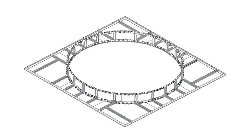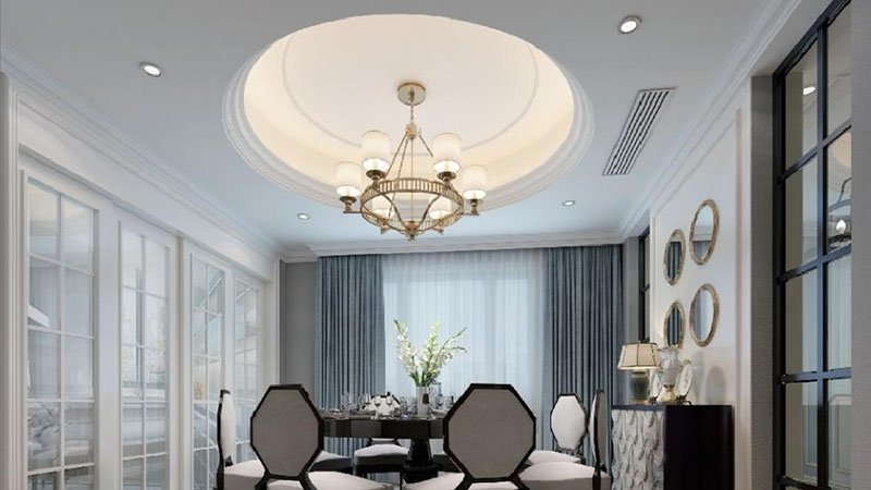This combination is a circular ceiling with a light trough. It is assembled from 50X30 cladding keels, side keels, curved keels and curved light trough keels with side cladding plug-ins, fixings, rotating connectors and light trough support parts. The vertical support uses 50X30 cladding keels, and the top keel is a curved keel. The curved keel and curved light trough keel can be bent freely to produce various special-shaped ceilings, including round, oval, eggshell, etc.